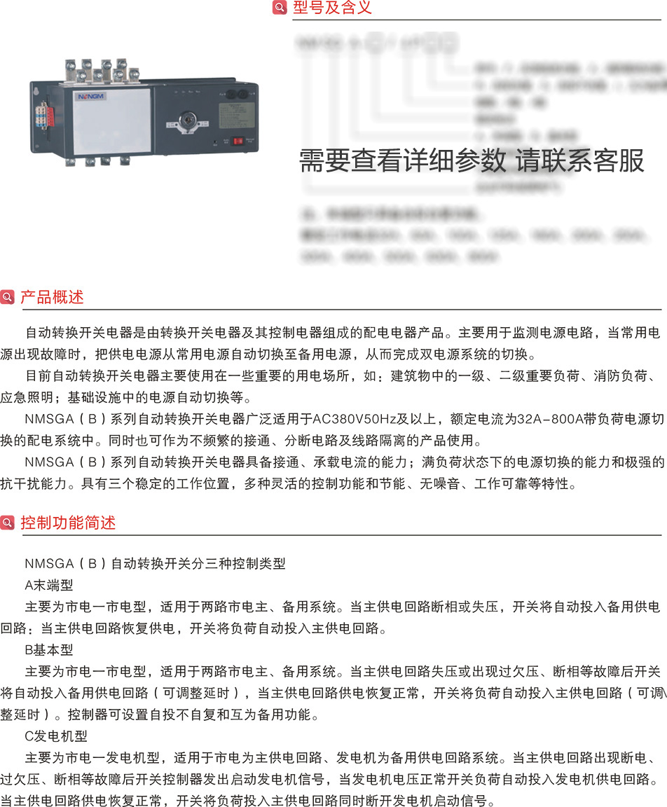 NMSGA(B)-100~800A萬高型雙電源自動轉換開關PC級
